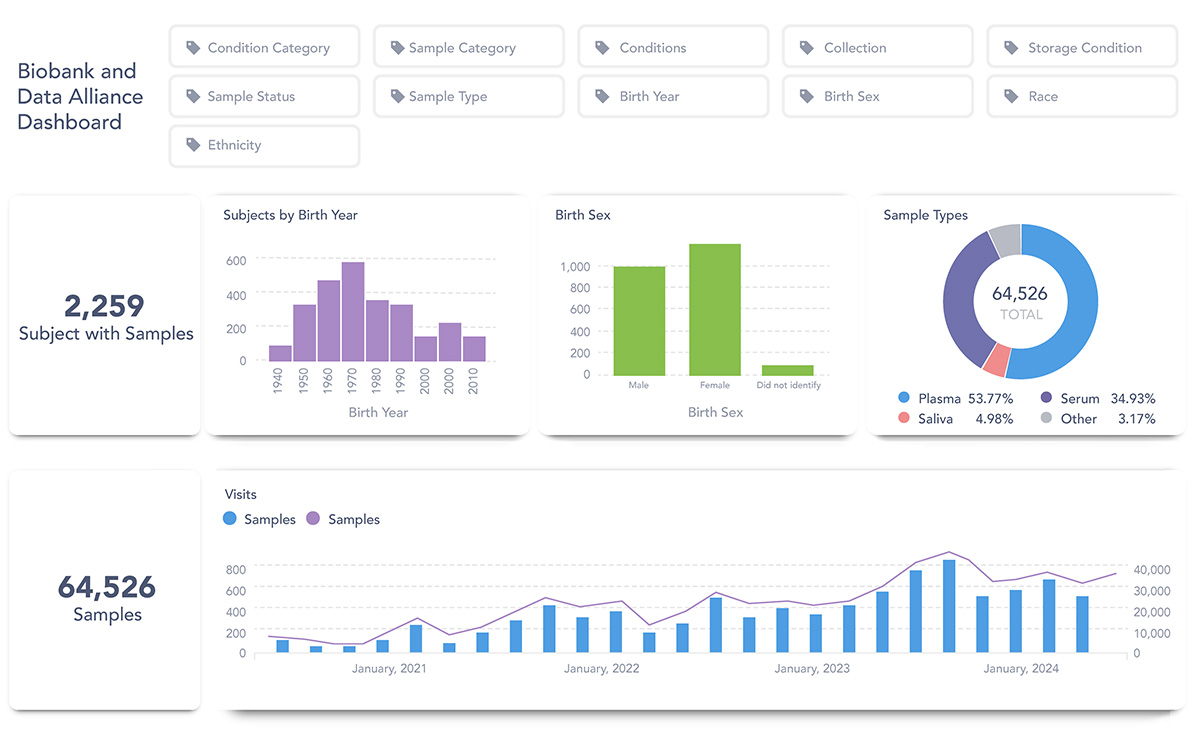 The Metabase’s dashboard allows interested researchers to search the sample repository catalogue and database using a base set of query criteria. Researchers interested in accessing the resources found in the Metabase must complete a four-step process to request access to samples.